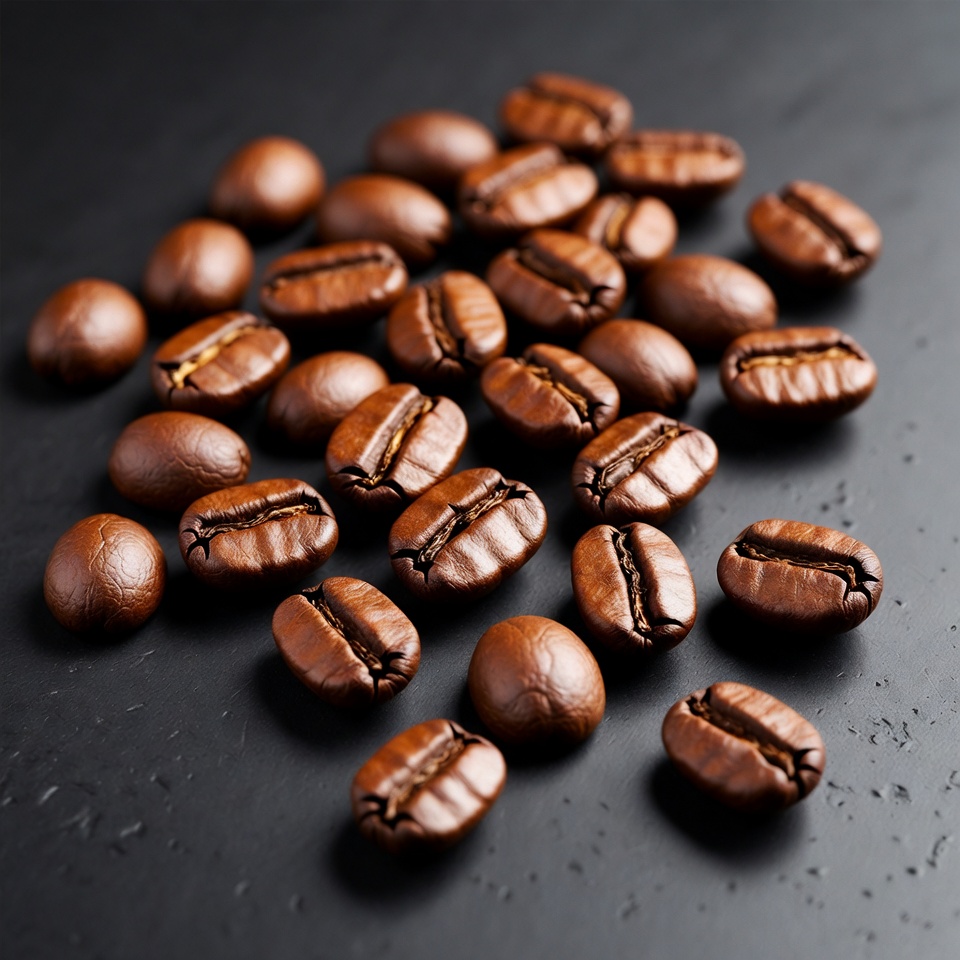 Brown coffee beans are scattered on a black surface. The beans have deep creases and vary in shape. They are ready to be ground.
