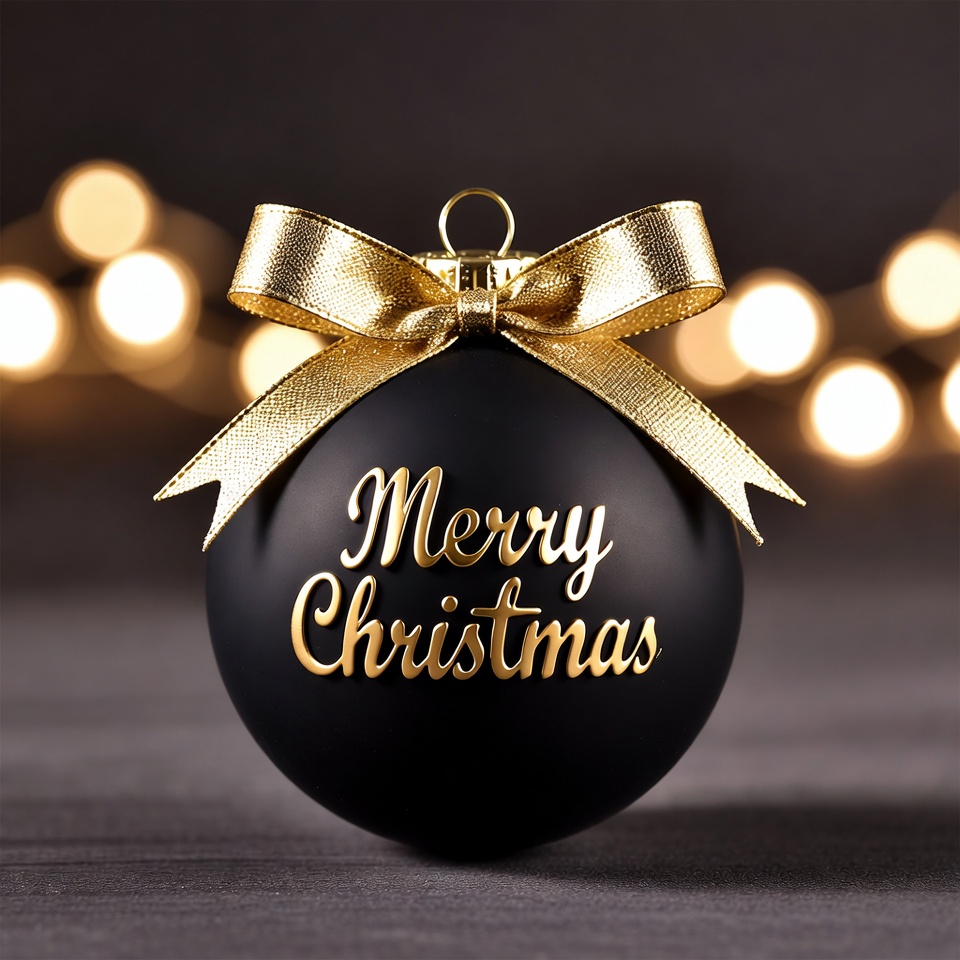 A round black ornament with the words Merry Christmas in gold. It is decorated with a gold ribbon and has lights in the background.