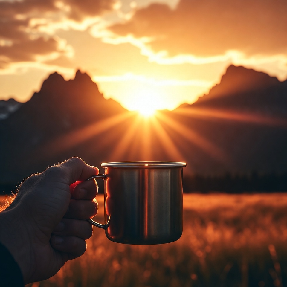 adventure, camping, coffee, exploration, golden hour, grassy field, hand, landscape, metal cup, morning, mountains, nature, outdoors, peacefulness, peaks, scenic view, sky, sunlight, sunrise, tranquility