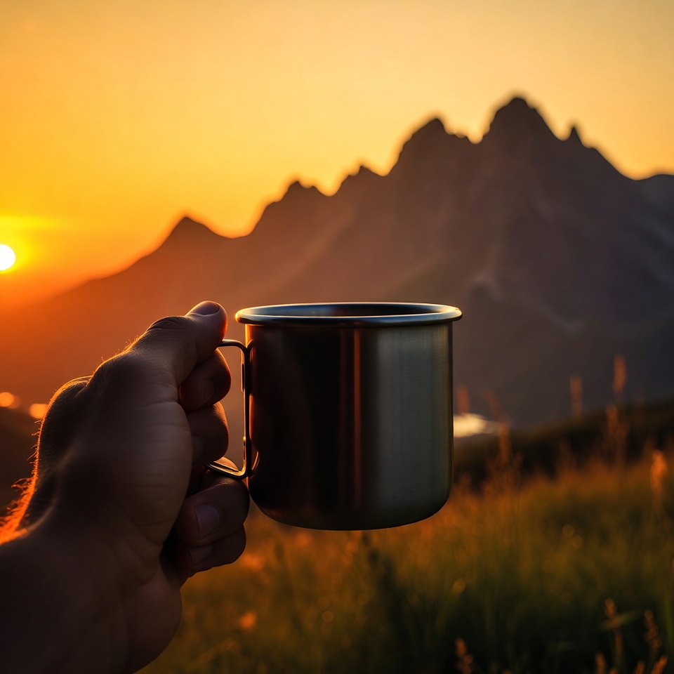 A person holds a metal cup while watching a sunset over mountain peaks. The sun casts orange light on the landscape.