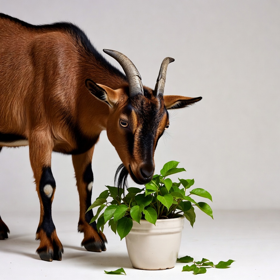 A goat stands near a potted plant, munching on the leaves in a bright indoor space. The goat appears curious about its surroundings.