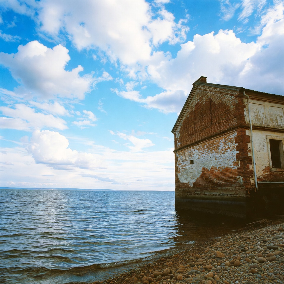A worn structure stands near the shoreline, with water lapping against its base and clouds scattered in the sky above at sunset.