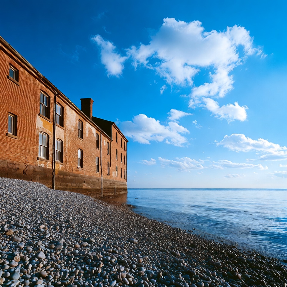 architecture, blue, brick, building, clouds, coast, exterior, landscape, morning, nature, pebbles, reflection, serene, shore, sky, stone, sunlight, sunrise, water, wave