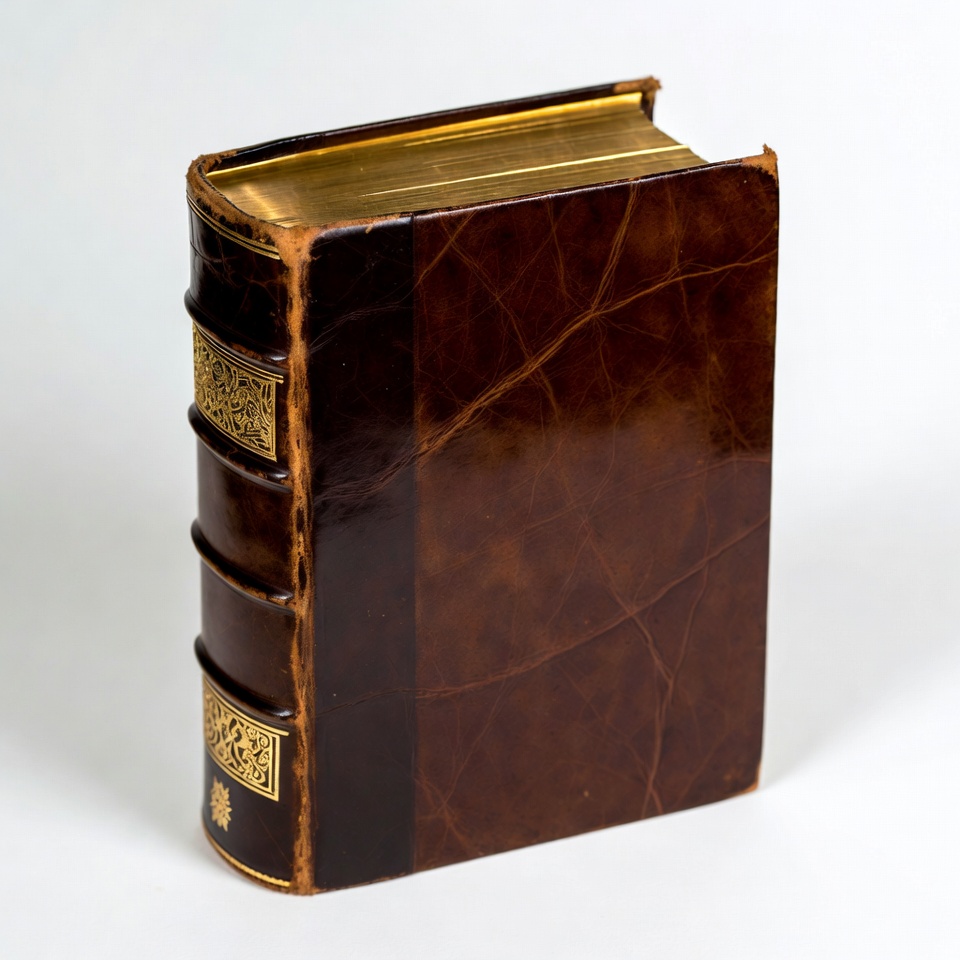 A brown leather book rests on a surface. It has gold details and appears aged. The spine shows multiple grooves, indicating heavy use.