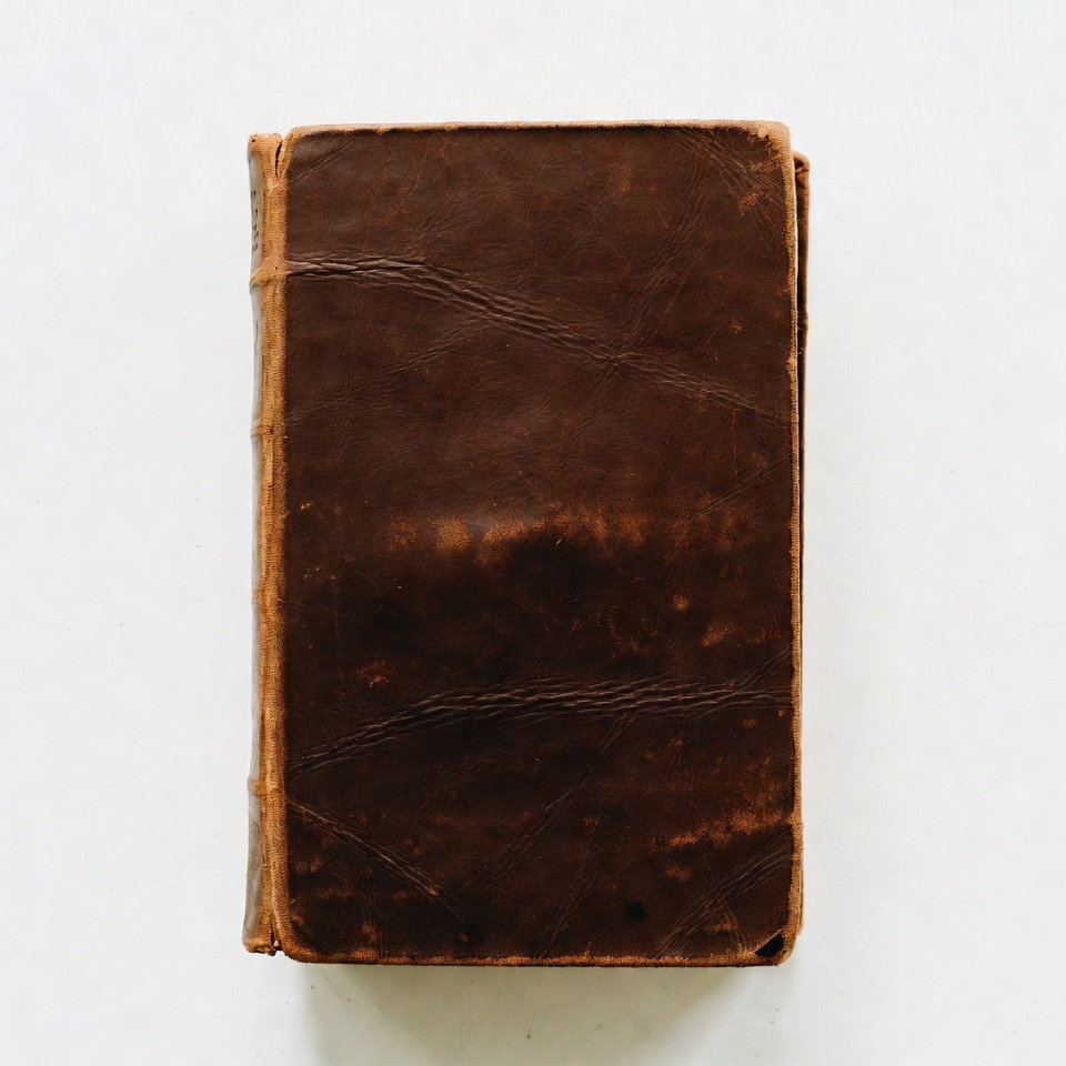 A brown leather book rests on a white surface. The cover is worn and shows signs of age. This book may hold stories and knowledge.