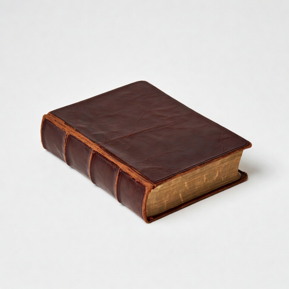 A brown leather-covered book rests flat on a table. The book has a classic design with visible spine details.