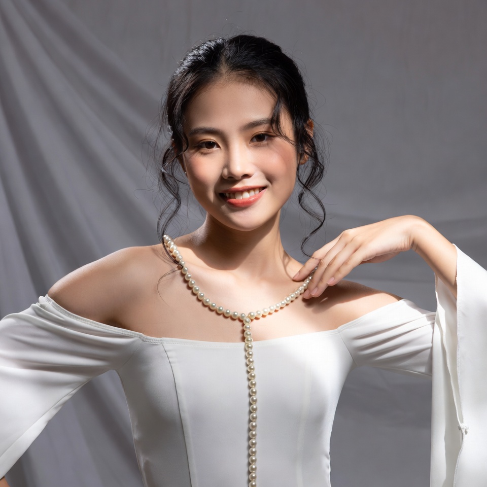 A young woman poses confidently while wearing a white dress. She holds a string of pearls around her neck. The background is simple and light.