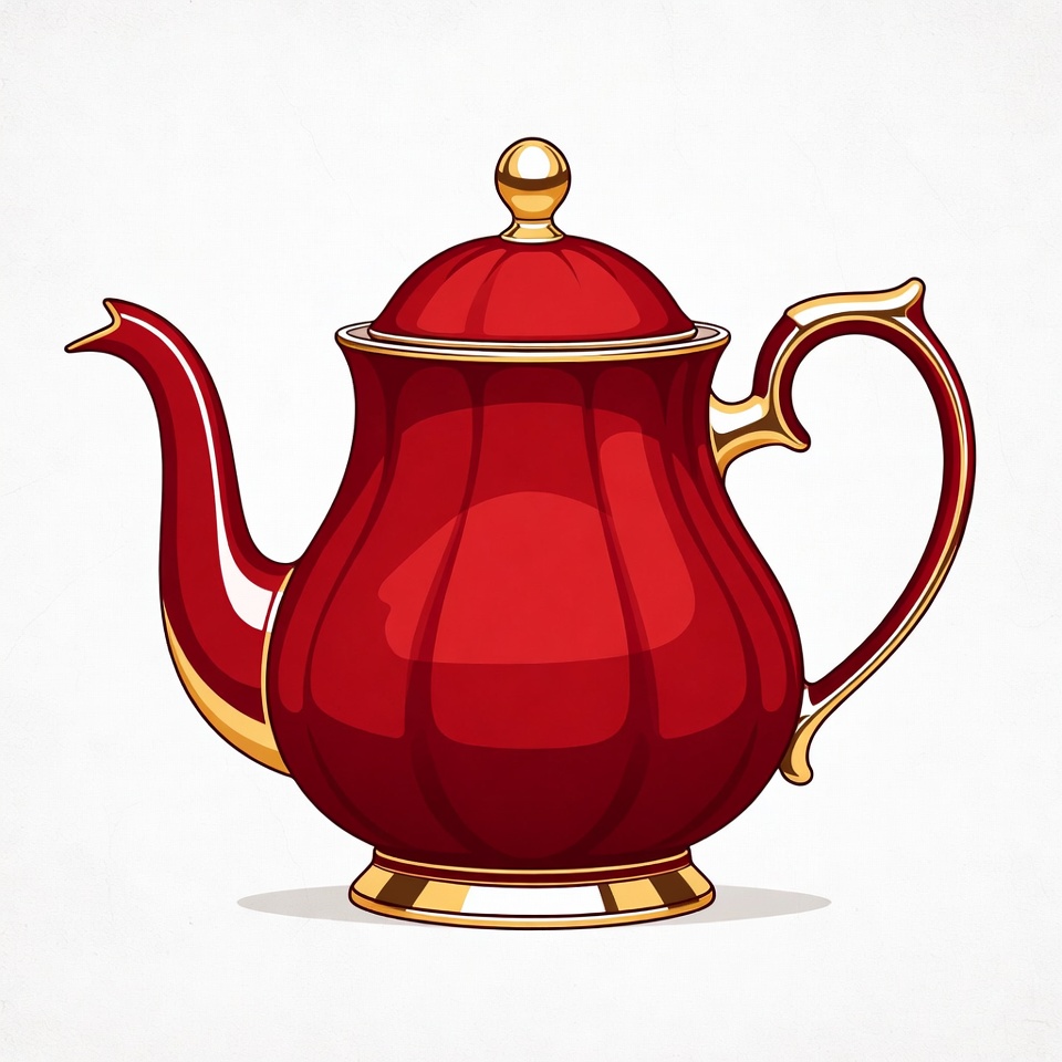 A red teapot sits on a plain background. It has a curved spout and a shiny gold handle. The pot has a smooth finish and an ornate lid.