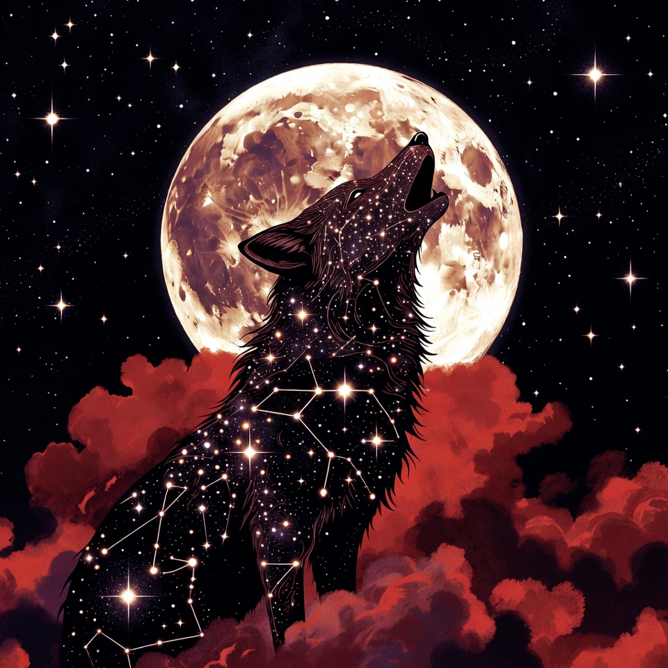 A wolf howls against a full moon surrounded by clouds and stars in a nighttime scene. The wolf's fur shows constellations in the sky.