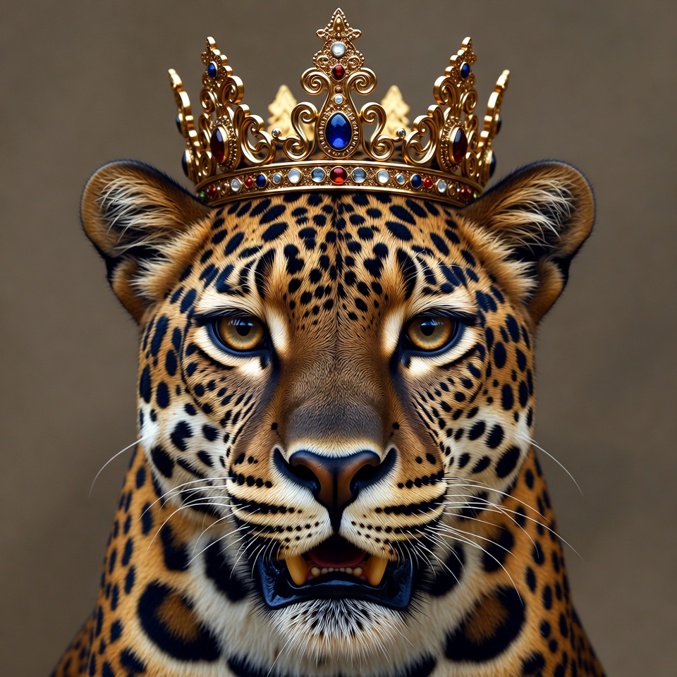 A leopard with a crown sits proudly, showcasing its detailed fur and strong presence, highlighting artistry and creativity in animal representation.