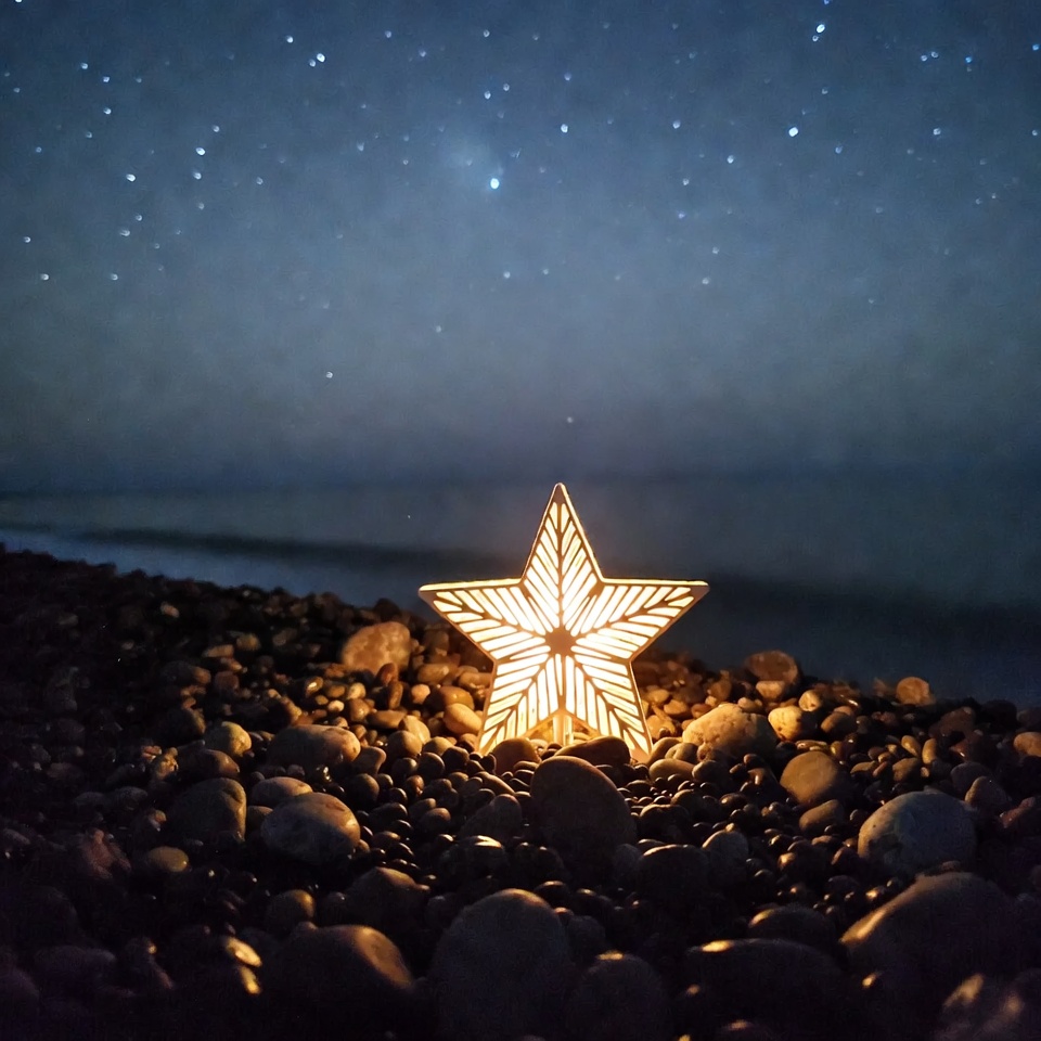 A star-shaped lantern sits on the beach among pebbles while stars shine in the night sky. The atmosphere is calm and inviting.