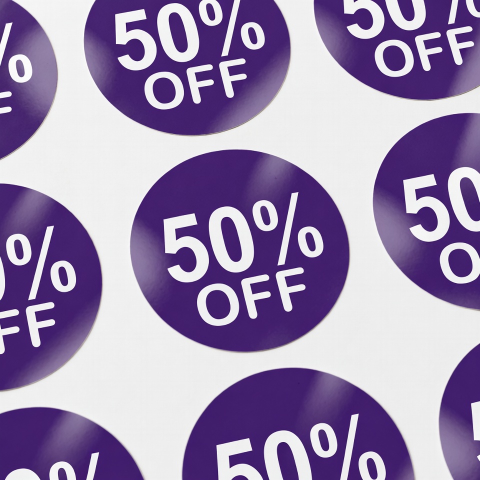 Sale stickers with discount offers on display