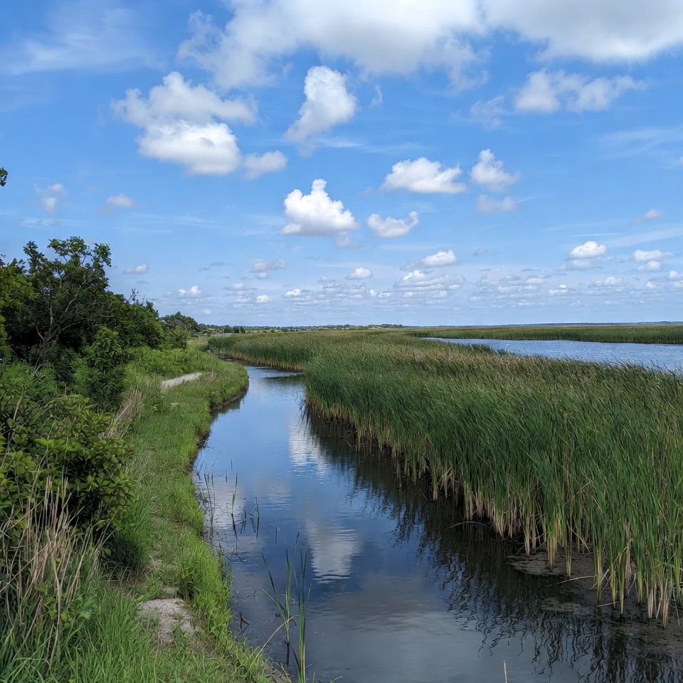 A river winds through tall grass with trees nearby. The blue sky is filled with clouds. The scene shows nature on a clear day.