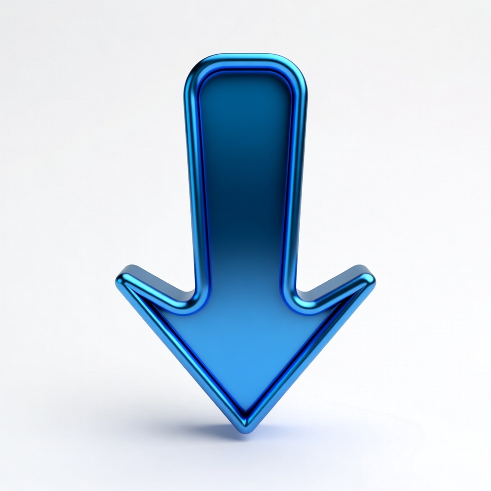 A blue 3D arrow is pointing downwards. The arrow has a shiny surface and a smooth shape. It is set against a plain background.