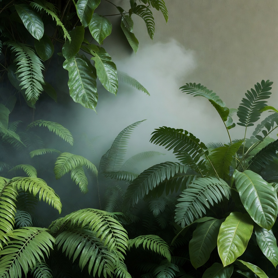 Dense green plants surround smoke drifting through the air. This scene captures the interaction of nature and mist indoors.
