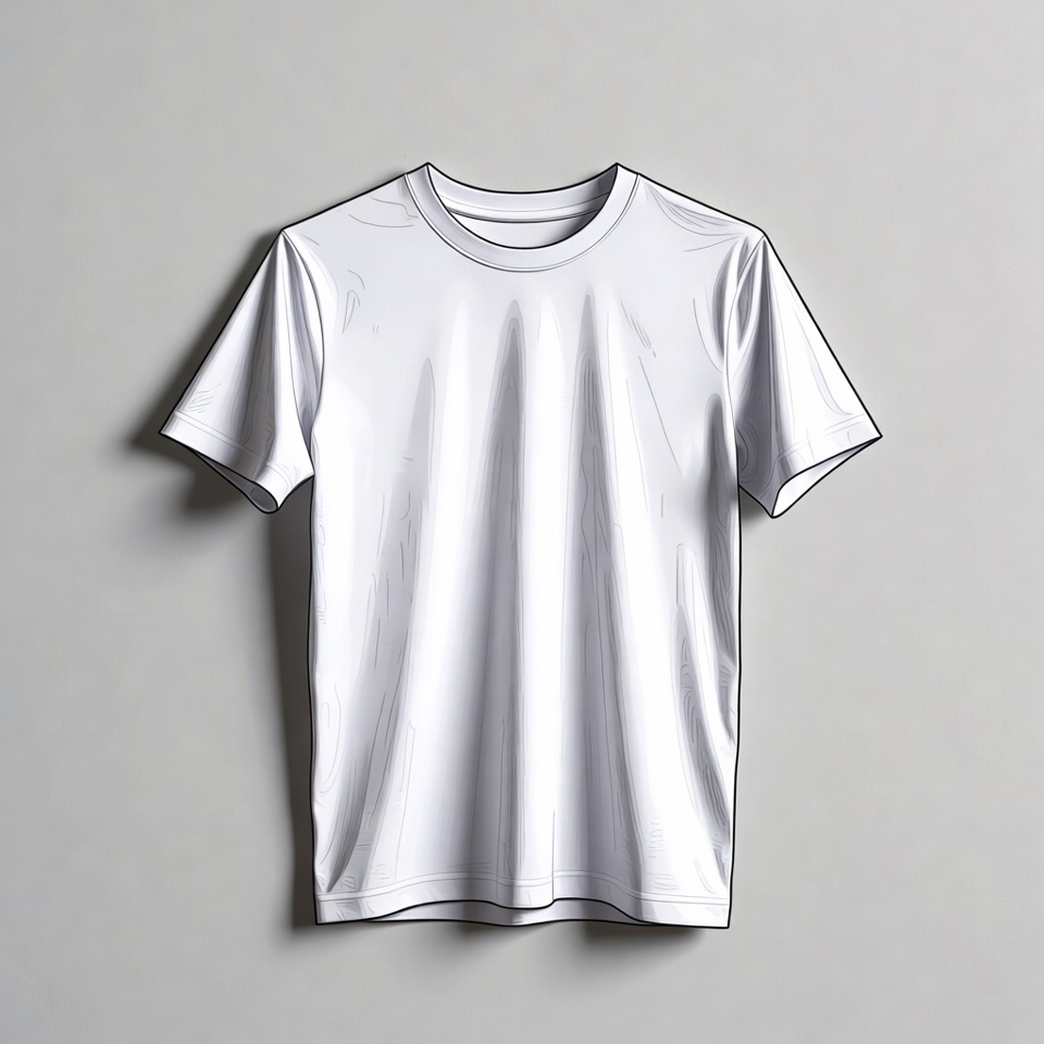 A plain white T-shirt hangs on a gray wall showing its simple design and structure. It is a common clothing item for everyday wear.