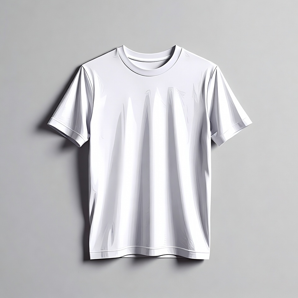 A white t-shirt is shown hanging against a plain wall. The fabric appears smooth and wrinkle-free, with no designs or logos visible.