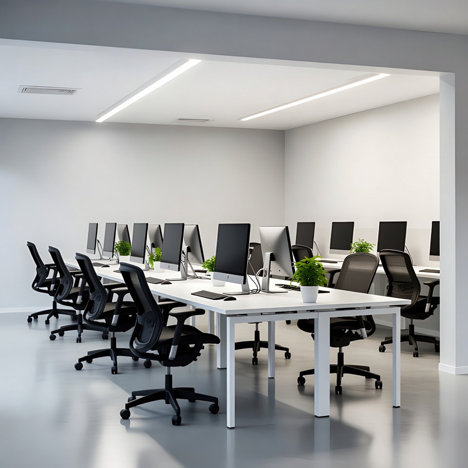 area, bright, chairs, clean, computers, design, desks, equipment, furniture, interior, lighting, minimalist, modern, office, organization, plants, professional, technology, work, workspace