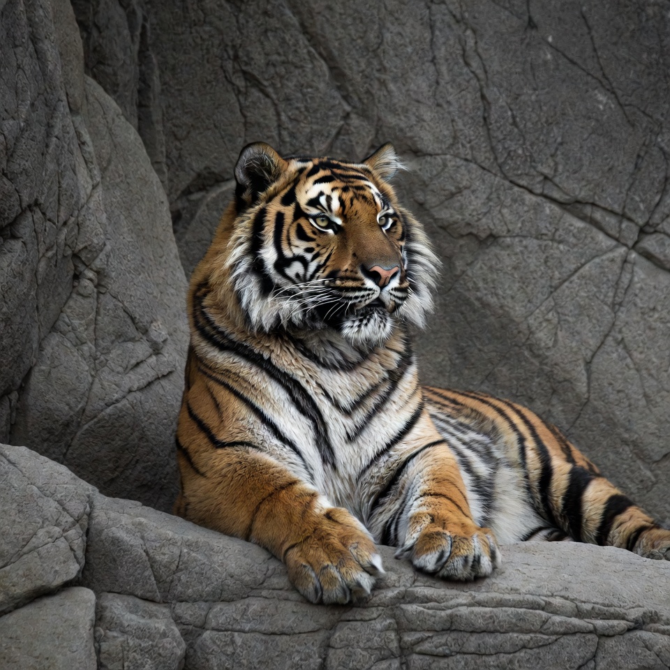 animal, big cat, black stripes, body, calm, environment, eyes, fierce, habitat, landscape, nature, orange, outdoors, paws, predator, resting, rock, terrain, tiger, wildlife