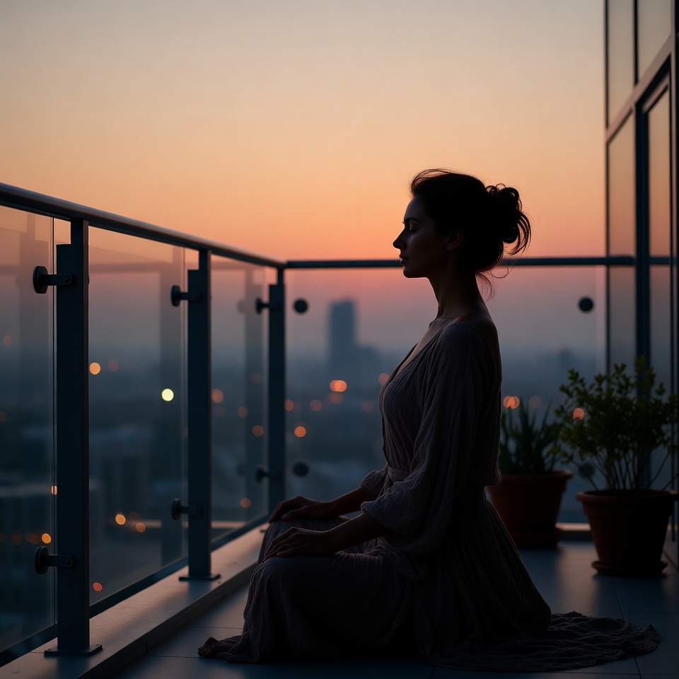 balcony, building, calmness, city, evening, high-rise, horizon, lights, meditation, mindfulness, nature, plants, practice, relaxation, rooftop, silhouette, solitude, sunset, urban, woman