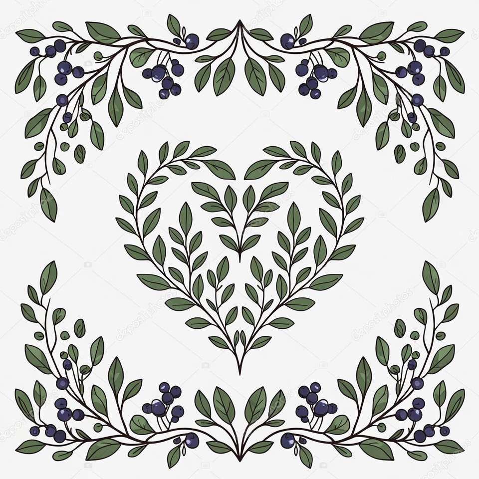 artwork, berries, botanical, creative, decoration, decorative, design, floral, foliage, frame, green, heart, illustration, leaves, light, nature, organic, pattern, simple, symmetry