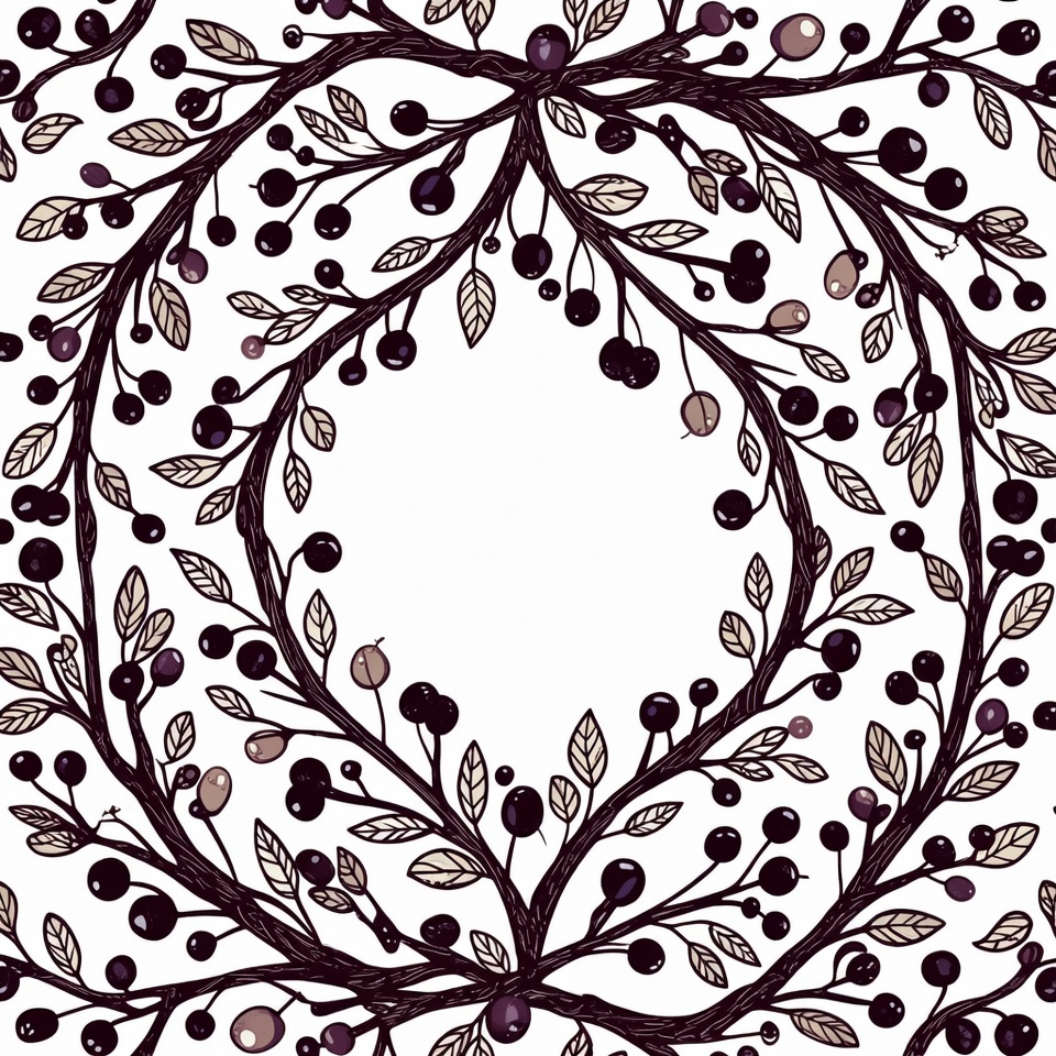 The design features a pattern of black berry branches with leaves arranged in an oval shape, creating a balanced and simple look.