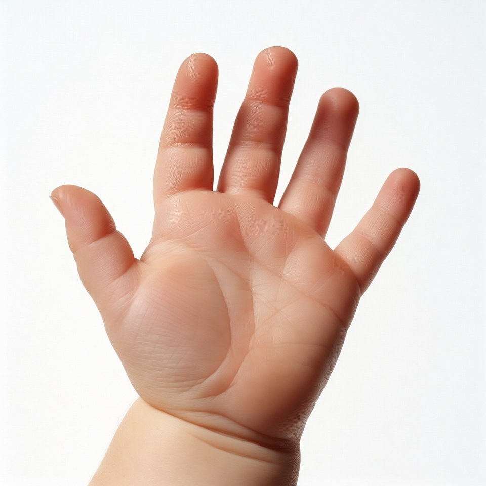 A small hand is reaching forward, showing fingers and palm against a light background. It suggests curiosity and innocence.