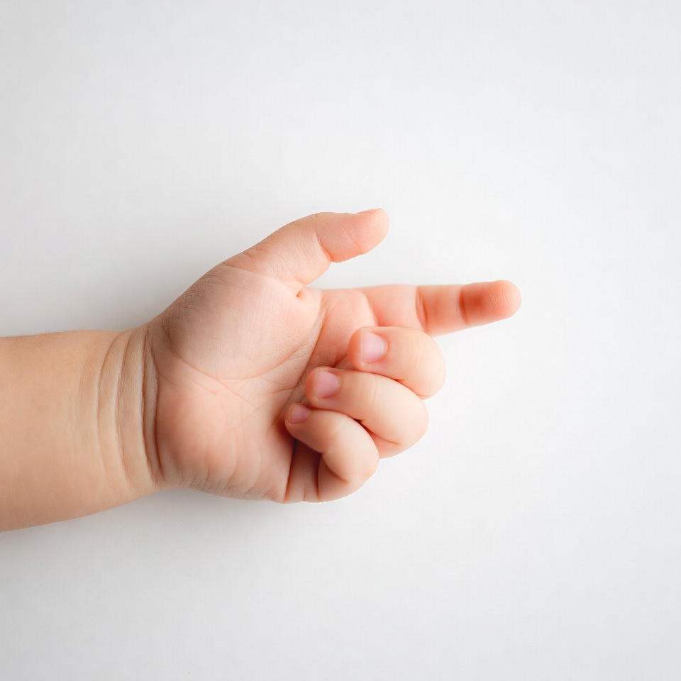 A small hand extends with fingers pointing outwards, showing curiosity. The background is light, creating focus on the hand.