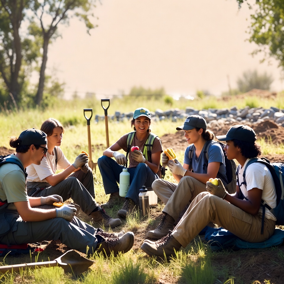 activity, break, community, friendship, gathering, grass, group, landscape, nature, outdoor, people, relaxation, sharing, sitting, smiles, snacks, sunny, teamwork, tools, trees