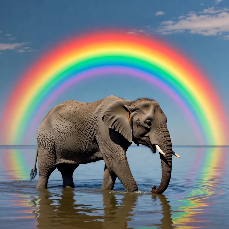 An elephant wades through shallow water while a rainbow arches overhead in a blue sky. The scene captures wildlife in nature.