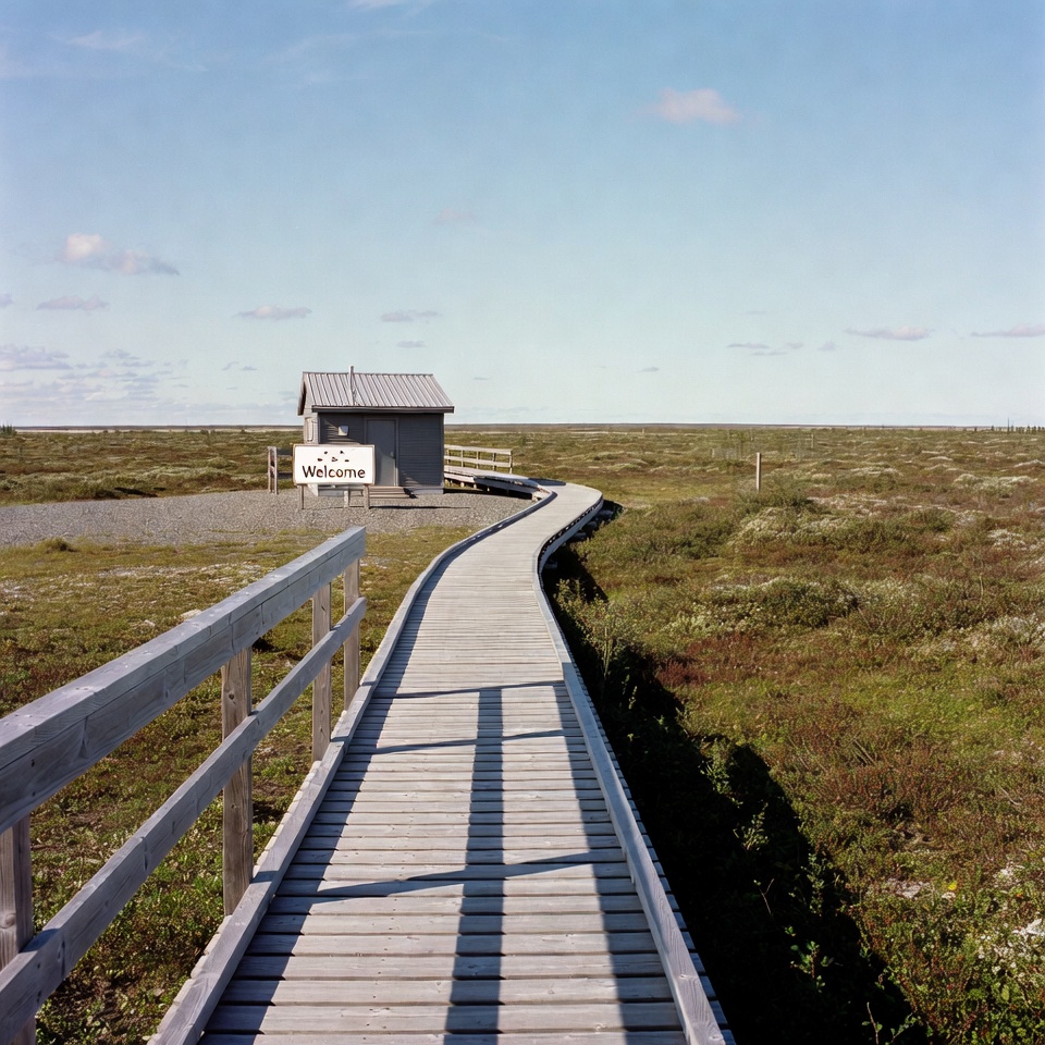 boardwalk, building, clouds, destination, grass, landscape, nature, open space, outdoor, rural, scenic view, shrubbery, sky, sunlight, tour, tourism, travel, visitor center, welcome center, wooden path