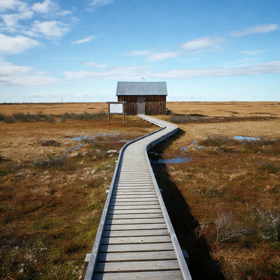 blue sky, boardwalk, clouds, exploration, flat land, grass, landscape, natural scenery, nature, outdoor, pathway, rural area, sightseeing, small building, solitude, structure, travel, water, wetlands, wooden house