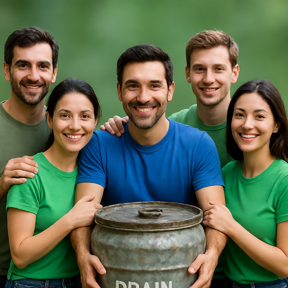 Five people stand together outdoors holding a large metal container. They smile while posing for the moment, surrounded by greenery.