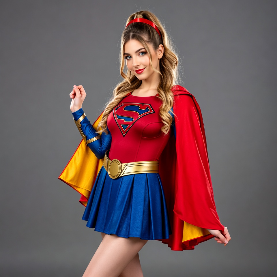 action, cape, character, colorful, costume, creative, entertainment, fantasy, fashion, female, fun, gray background, outfit, performance, playful, pose, skirt, studio, superhero, theme
