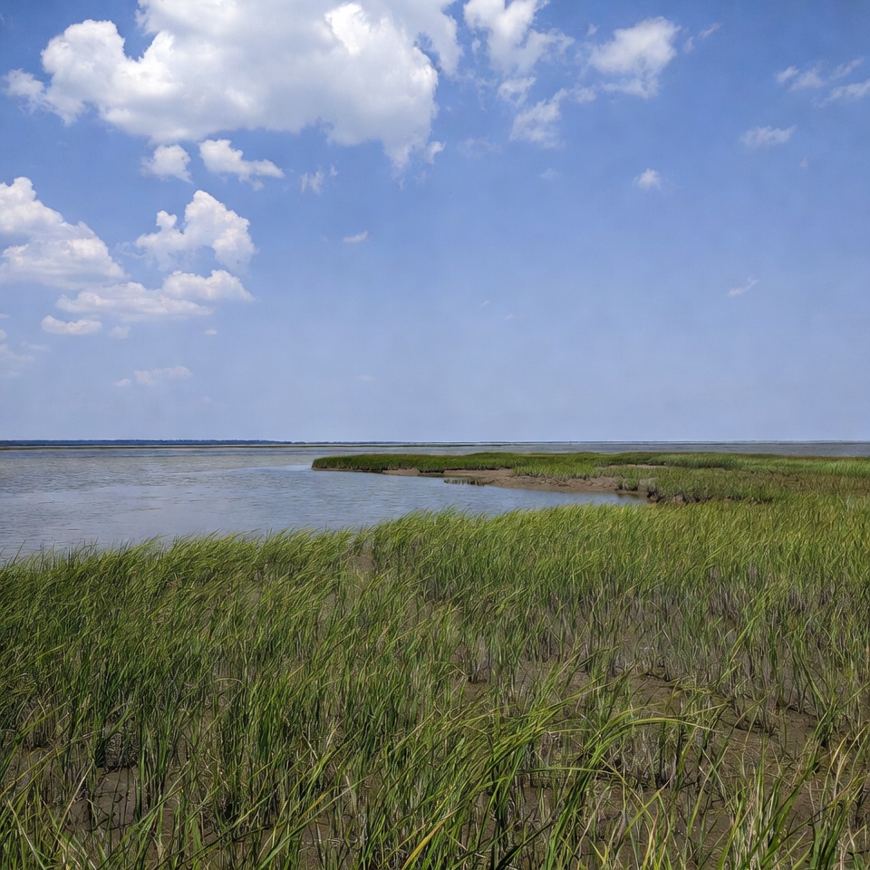 Tall grass sways along a coast under a blue sky with clouds. The water glimmers in the sunlight as it meets the land in the distance.