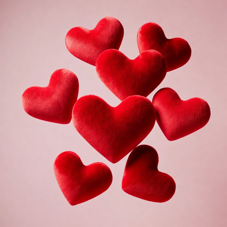Red hearts made of soft material float against a light background. The scene suggests themes of love and affection.