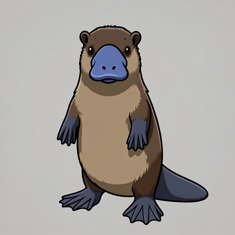 A cartoon character of a platypus stands upright. The platypus has a blue bill and brown fur. It looks friendly and curious.