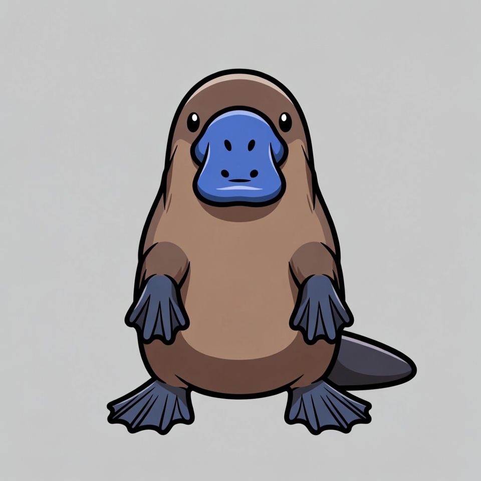 A cartoon platypus stands in front of a gray background. It has a blue face and hands, with a brown body and a flat tail.