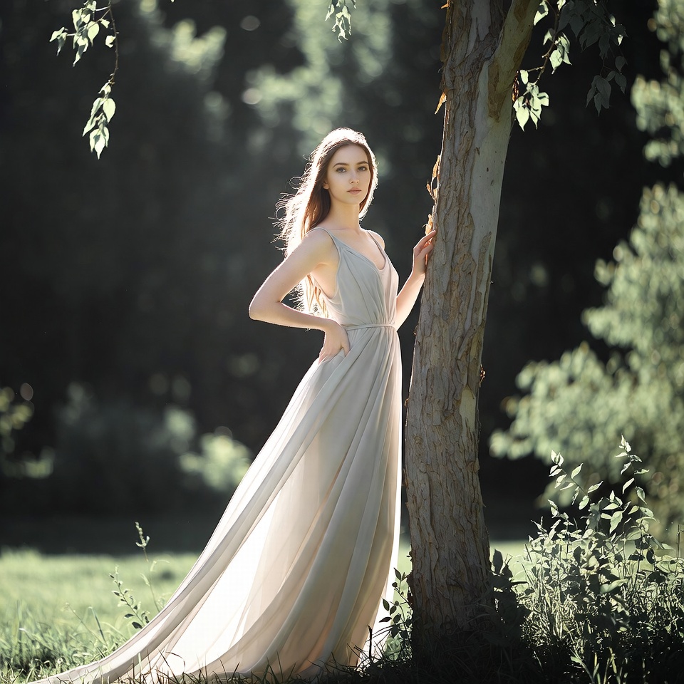 A woman stands by a tree in a field. She wears a long dress and poses calmly while surrounded by nature in soft light.