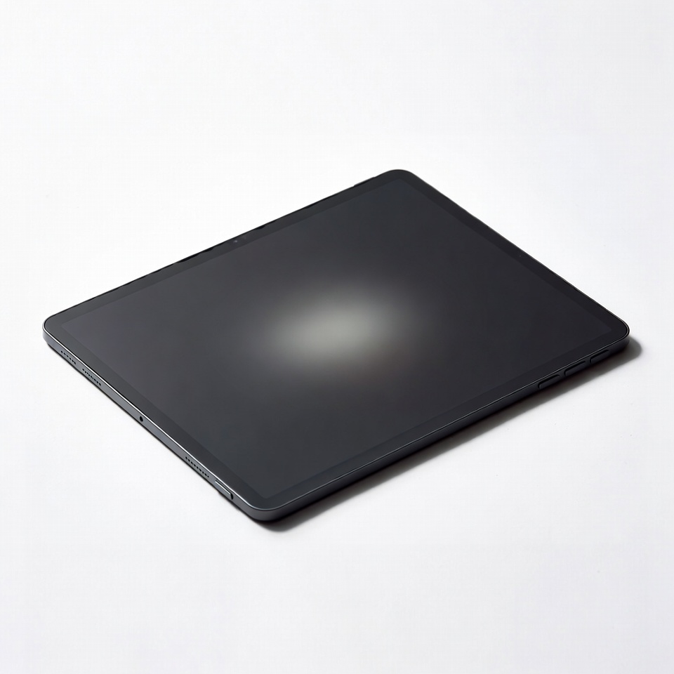 A black tablet lies flat on a simple white surface. The device is idle without any visible screen activity.