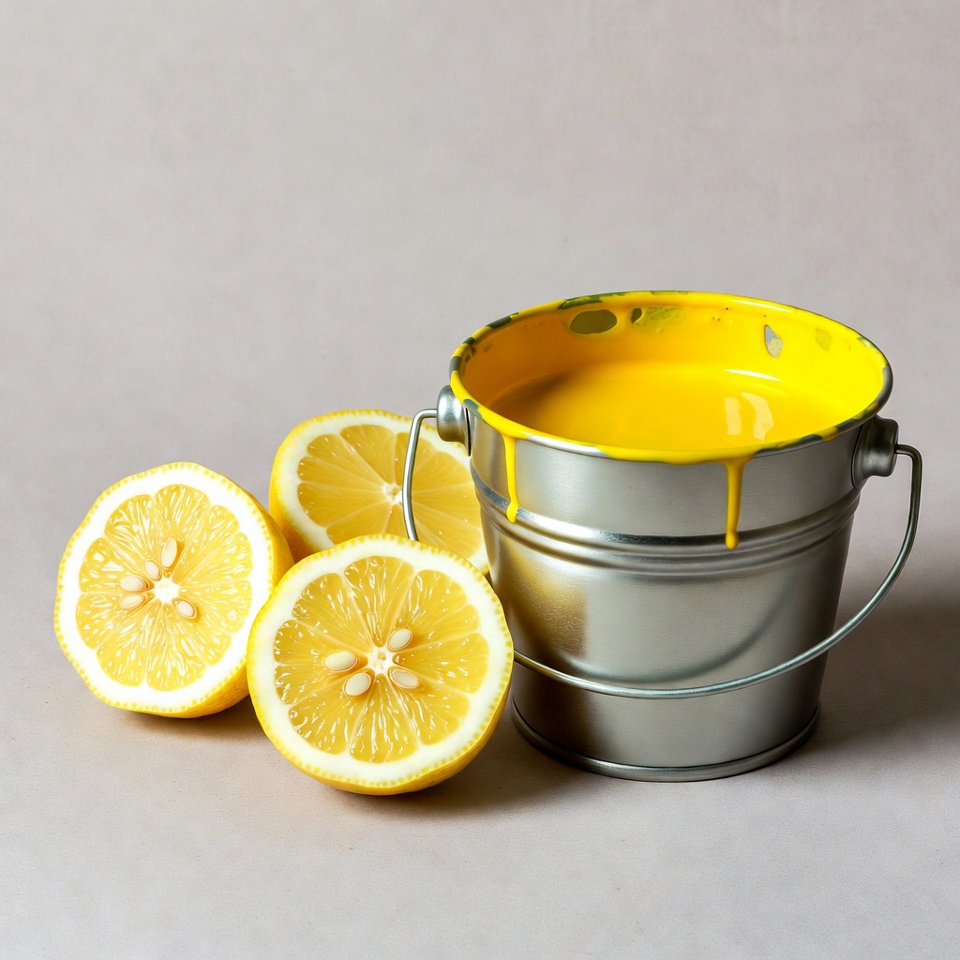 Yellow paint drips from a metal bucket next to fresh lemon halves on a plain surface. The scene shows painting supplies and fruit.