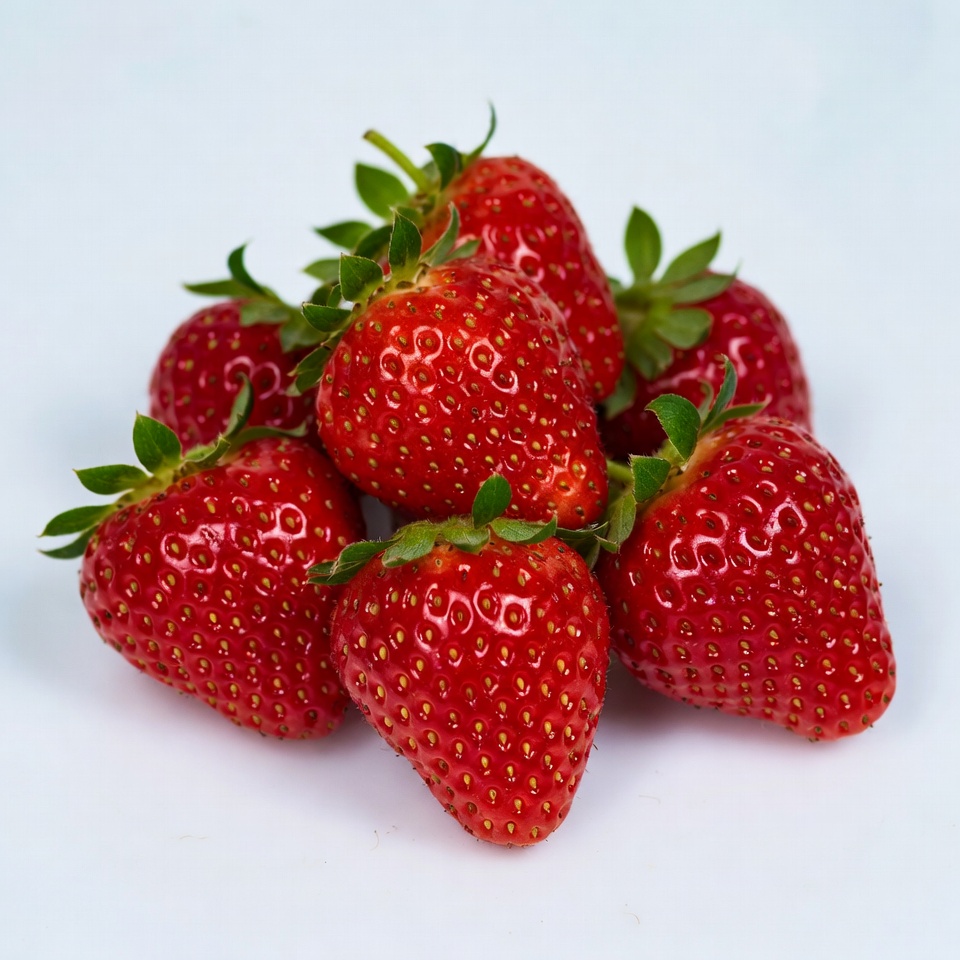 A group of strawberries is arranged on a white surface. The red fruit has green leaves at the top. They look ripe and ready to eat.