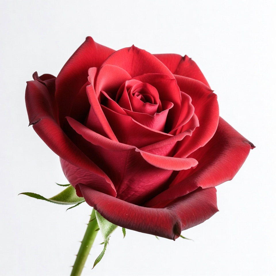 A red rose with tightly closed petals stands against a white background. The rose shows detail in its shape and color.