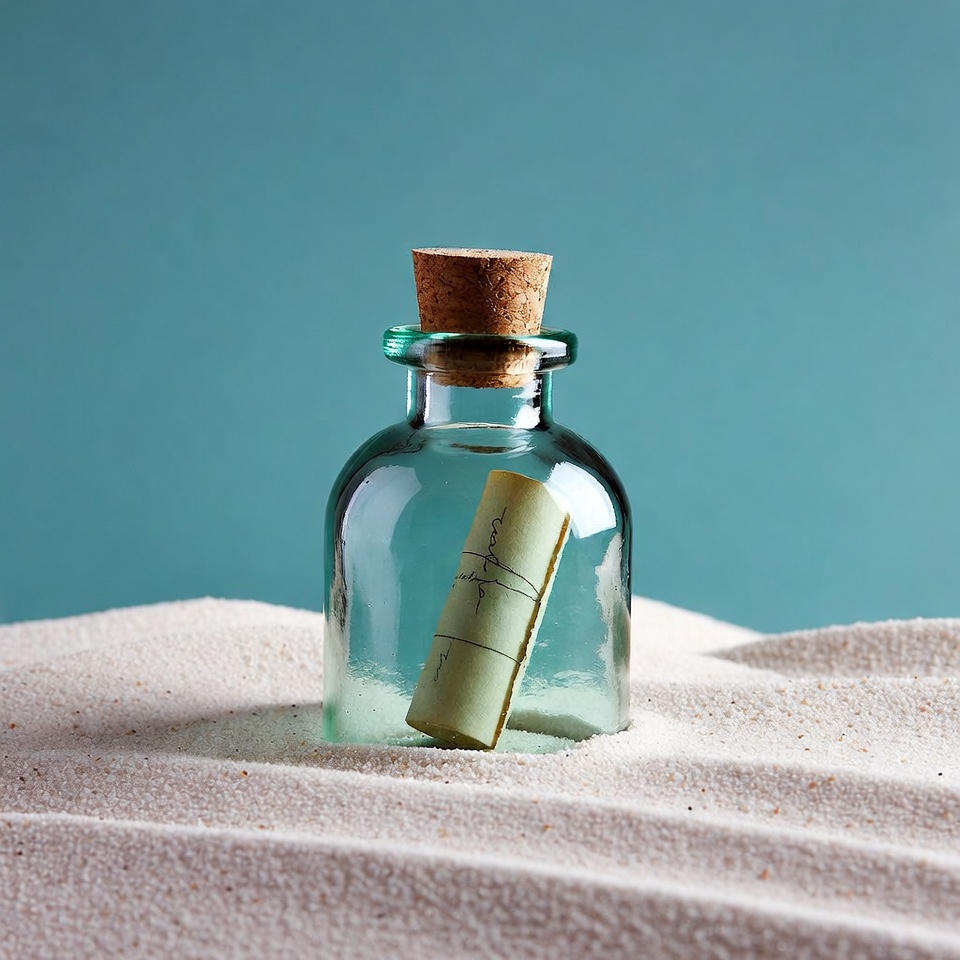 A small glass bottle with a cork sits on fine sand. A rolled-up paper is inside the bottle. The background is a solid color.