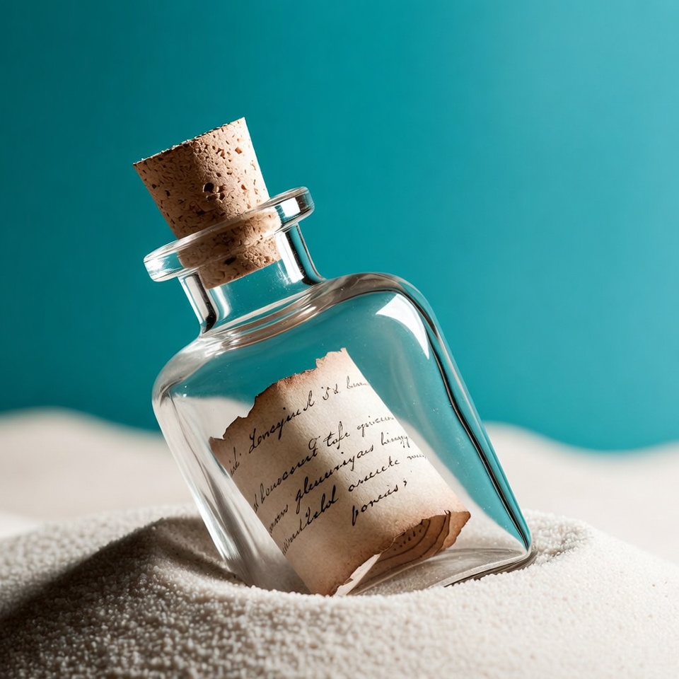 A glass bottle rests on sand with a rolled paper inside. The background is plain blue, highlighting the bottle's details and texture.