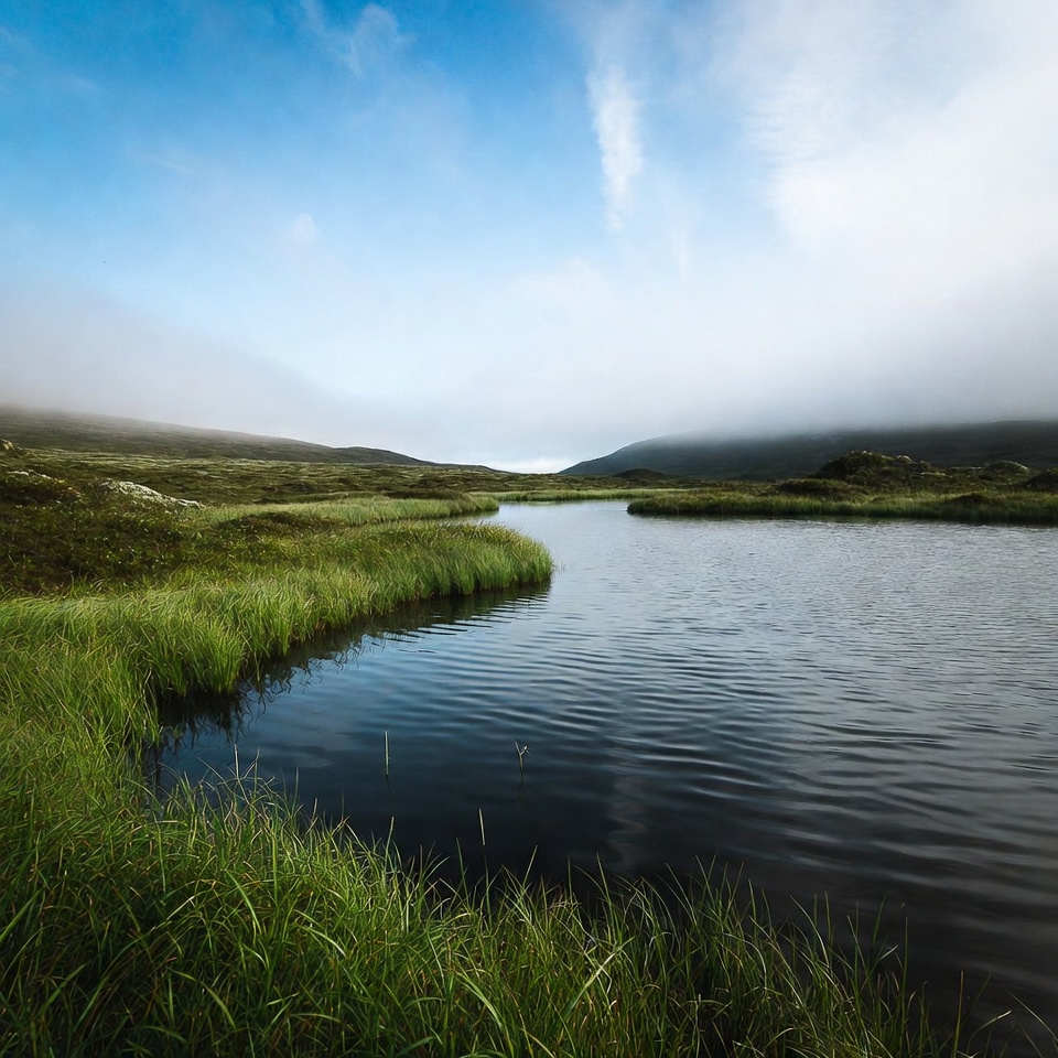 blue sky, environment, fog, grass, green, hills, lake, landscape, nature, outdoor, peacefulness, reflection, river, scenery, summer, tranquility, travel, vegetation, water, wetland