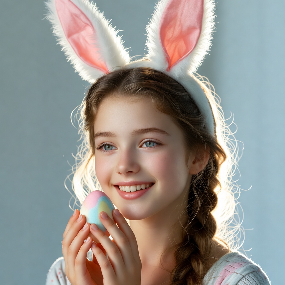A girl wearing bunny ears smiles while holding a colorful egg. The photo captures the joy of an Easter celebration.