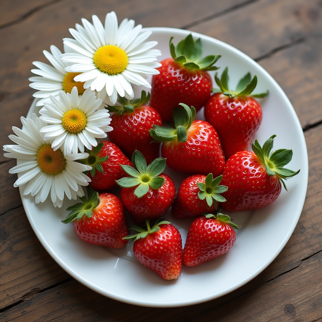 A plate holds red strawberries and white daisies on a wooden table during daylight. The fruits and flowers create a simple, fresh arrangement.