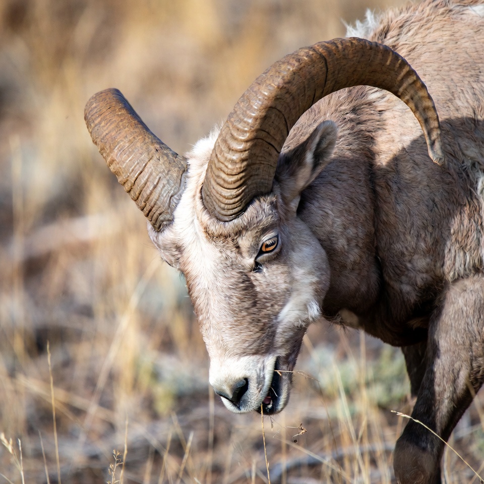 North America, animal, animal behavior, bighorn sheep, brown, daytime, field, forage, grass, grazing, habitat, herd, horns, mammal, mountain, natural habitat, nature, outdoors, wild, wildlife