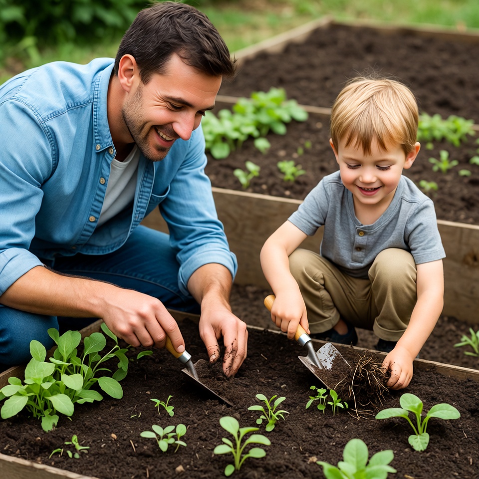 A man and a young boy are working together in a garden. They dig the soil and plant small seedlings in raised garden beds.